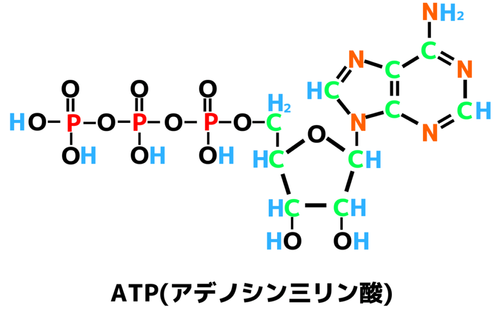 ATPとはAdenosine Triphosphate(アデノシン三リン酸)の頭文字をとったものです。