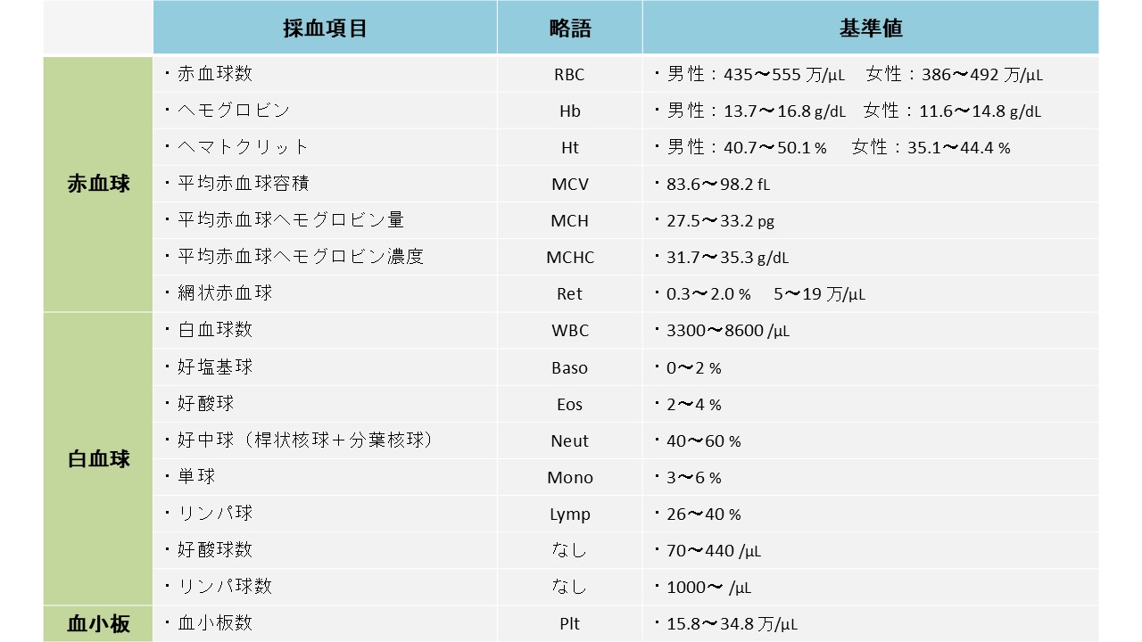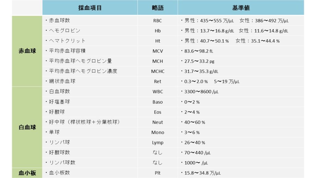 それでは、それぞれの血算の項目の意味と基準値について簡単に紹介します。