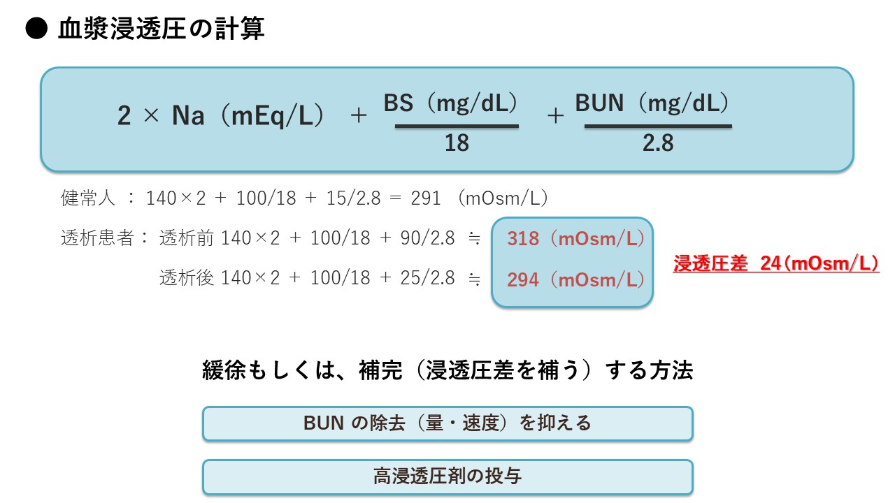 透析で血漿の尿素が先に急低下すると、脳内の尿素が追いつかず一時的に脳内>血漿の浸透圧になります。すると水が脳細胞側へ移動し、頭痛・嘔気などの症状が出やすくなります。