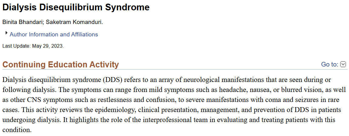 “primarily after the new initiation of dialysis… can also be seen in chronic dialysis patients who miss their regular dialysis treatments.” 国立バイオテクノロジー情報センター