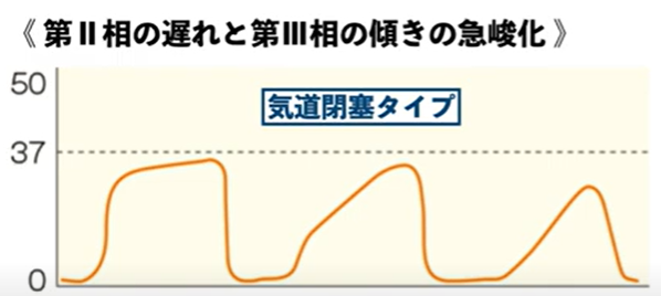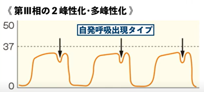 人工呼吸管理中に第Ⅲ相に凹部がみられ、2峰性化が認められる場合、呼気中に吸気が現れたことを意味します。