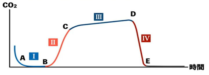 - Ⅰ相(A–B):解剖学的デッドスペース。CO2ほぼ0。