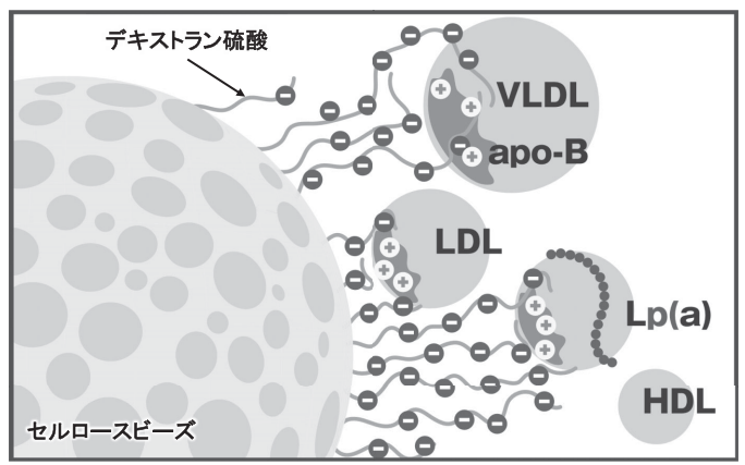 つまり、マイナスに荷電している「デキストラン硫酸」とプラスに荷電している「apoB-100」との静電相互作用により、血漿中のLDLとVLDLは吸着除去されます。