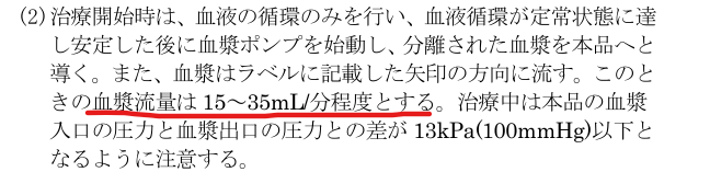 日本アフェレシス学会のデバイス手引きでも、血漿流量は15~35mL/minとするよう記載があります。