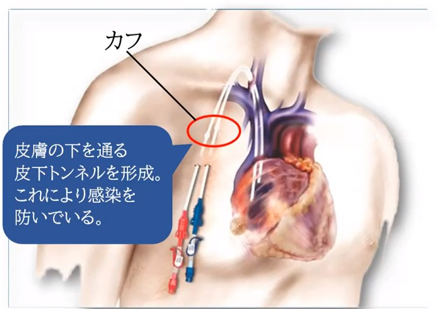 また、血管への刺入部から皮下トンネルを作製し、カテーテル出口部から血管への刺入部に距離を保ち、その間にカフを置くことで、カテーテル感染を減少させることができます。