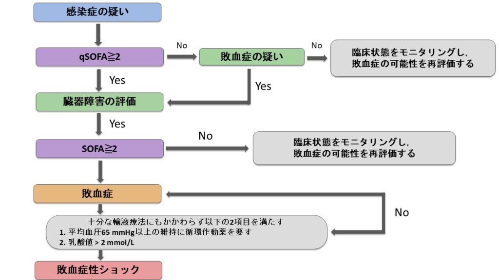 Sepsis-3では、上の図のフローチャートに沿って敗血症を診断することを推奨しています。