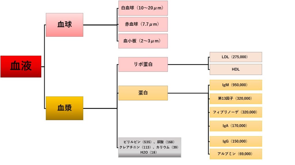 血液流量を70mL/minで設定した場合、ダイアライザに流入する血液は血球成分が21mL/min、血漿成分が49mL/minと分けることができます。